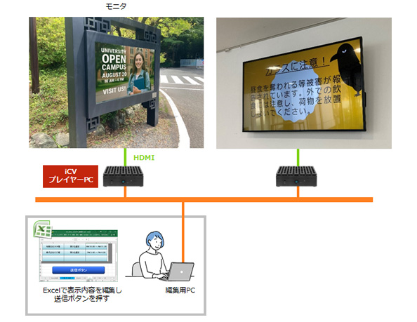 - 大学内の既設ネットワークを活用し、事務所から屋内外のサイネージに一斉配信